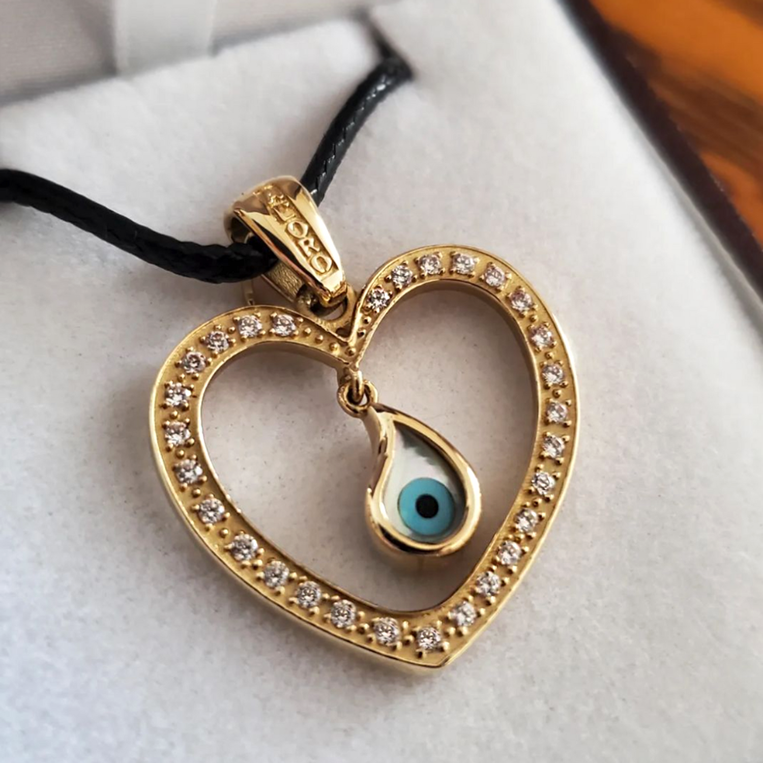 This Heart Evil Eye Pendant Necklace from Triantos Jewelry, in collaboration with AL'ORO, is the perfect addition to any jewelry collection. This pendant is a symbol of protection against harm.