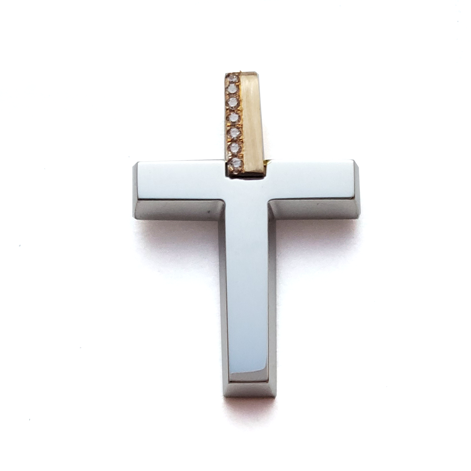 Explore the beauty of this 14K rose and white gold cross pendant with sparkling stones, offering a perfect blend of elegance and religious symbolism. A timeless piece for those seeking unique religious jewelry. This feminine modern cross combines 14K rose gold and white gold, creating a stunning religious pendant that offers style and spiritual meaning. Perfect for those looking for a unique religious jewelry piece. Featuring a brushed and polished finish, this rose gold and white gold cross combines modern design with timeless religious symbolism — a great choice for contemporary religious jewelry.